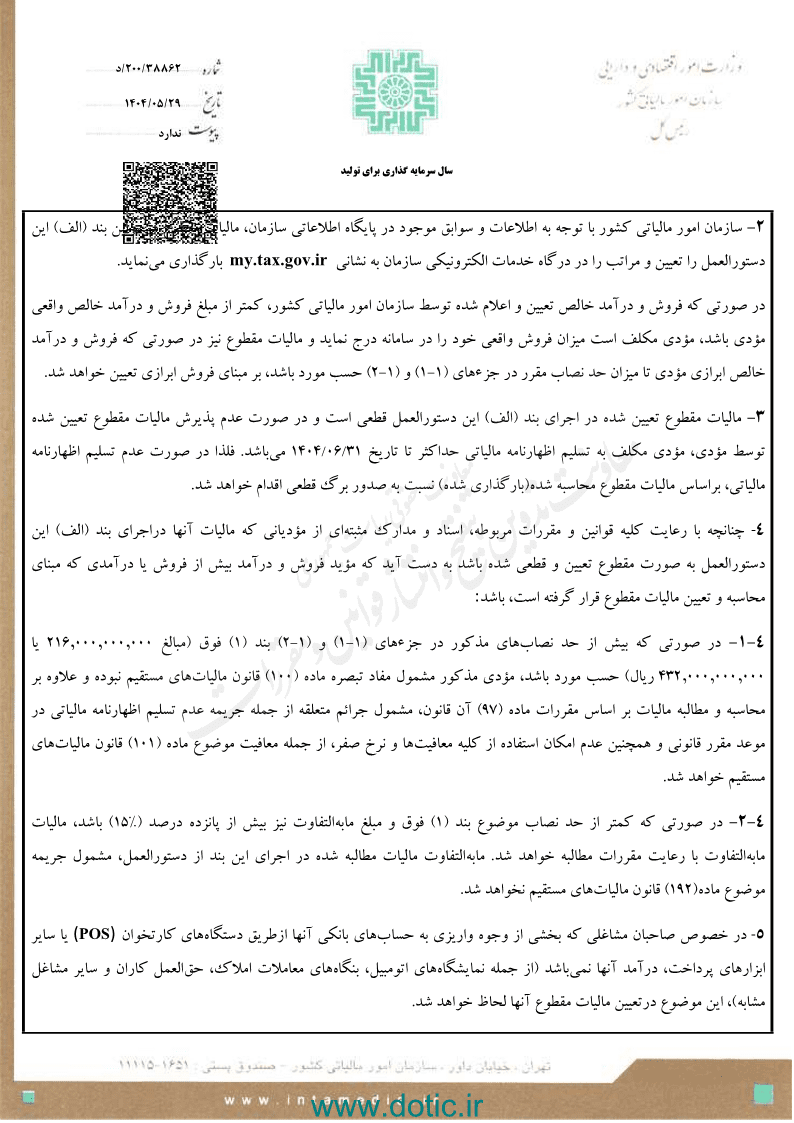 ۲- سازمان امور مالیاتی کشور با توجه به اطلاعات و سوابق موجود در پایگاه اطلاعاتی سازمان، مالیات مقطوع مشمولین بند (الف) این دستورالعمل را تعیین و مراتب را در درگاه خدمات الکترونیکی سازمان به نشانی my.tax.gov.ir بارگذاری مینماید.