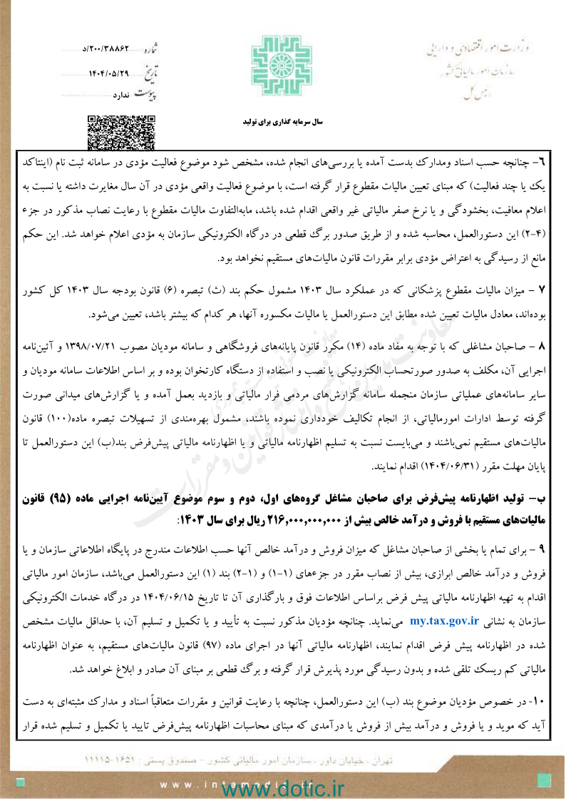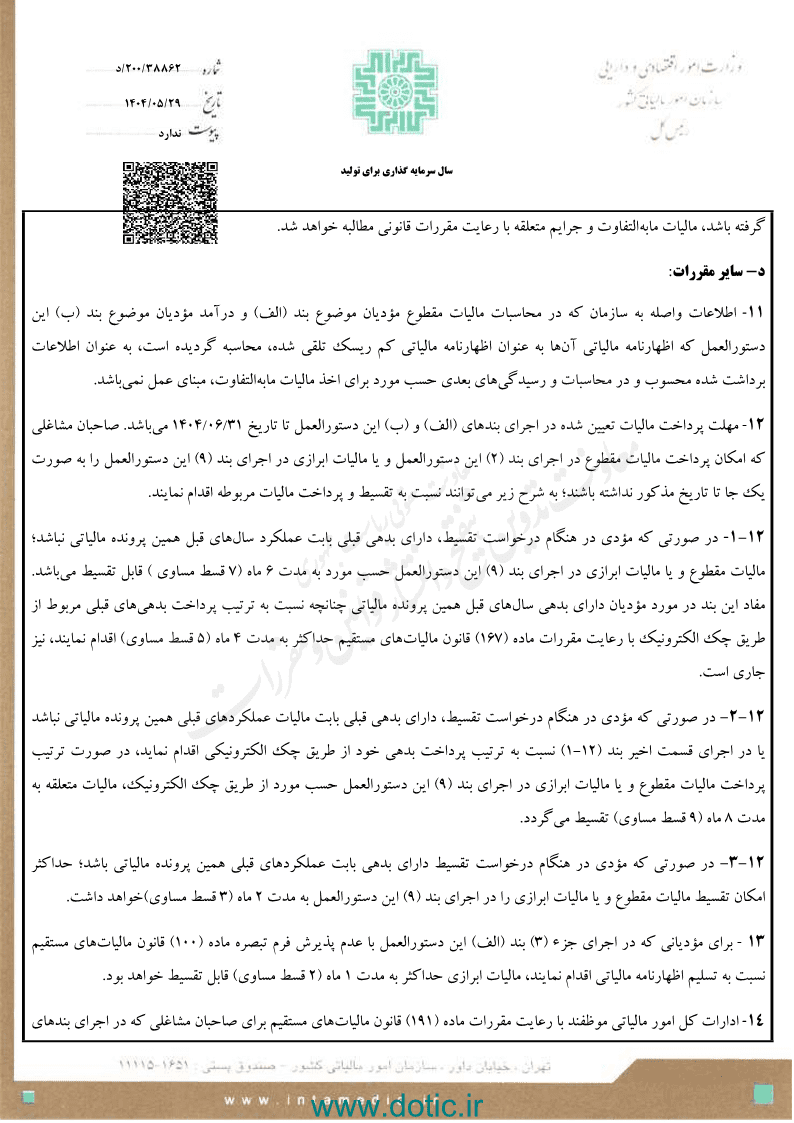 ۳- مالیات مقطوع تعیین شده در اجرای بند (الف) این دستورالعمل قطعی است و در صورت عدم پذیرش مالیات مقطوع تعیین شده توسط مؤدی، مؤدی مکلف به تسلیم اظهارنامه مالیاتی حداکثر تا تاریخ ۱۴۰۴/۶/۳۱ میباشد. فلذا در صورت عدم تسلیم اظهارنامه مالیاتی، براساس مالیات مقطوع محاسبه شده (بارگذاری شده) نسبت به صدور برگ قطعی اقدام خواهد شد.