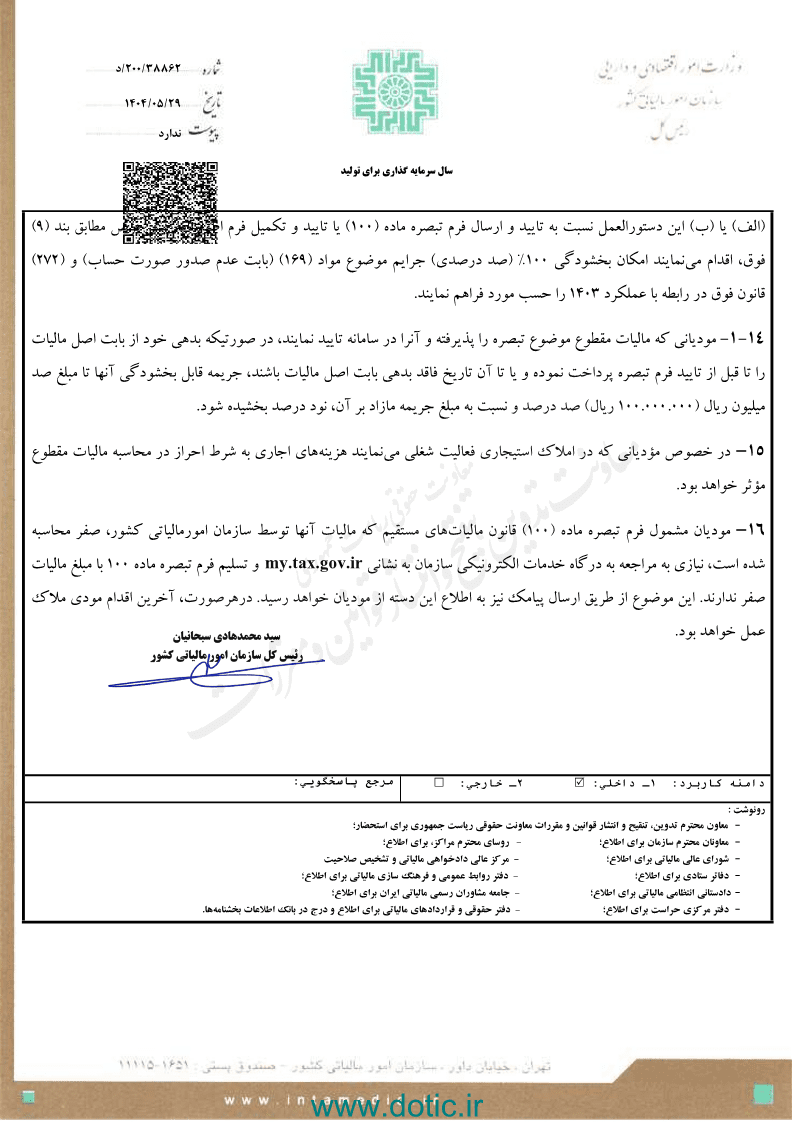 ۱۴- ادارات کل امور مالیاتی موظفند با رعایت مقررات ماده (۱۹۱) قانون مالیاتهای مستقیم برای صاحبان مشاغلی که در اجرای بندهای (الف) یا (ب) این دستورالعمل نسبت به تایید و ارسال فرم تبصره ماده (۱۰۰) یا تایید و تکمیل فرم اظهارنامه پیش فرض مطابق بند (۹) فوق، اقدام مینمایند امکان بخشودگی ۱۰۰% (صد درصدی) جرایم موضوع مواد (۱۶۹) (بابت عدم صدور صورت حساب) و (۲۷۲) قانون فوق در رابطه با عملکرد ۱۴۰۳ را حسب مورد فراهم نمایند.